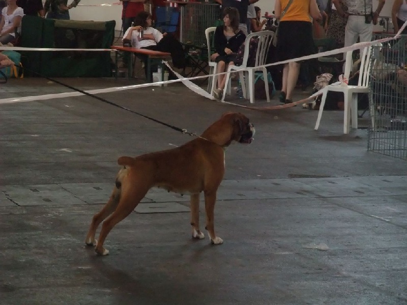 22mois, Taille moyenne. Fauve or marqué en blanc. TB tête type, tres expressive, avec excellent rapport crane/muscle.Belle hauteur de front. Oreilles biens portées.TB yeux marrons foncés avec belle forme en position.Mus. plein. Menton marqué. Denture moyennement large. TB sortie d'encolure. Construction carrée avec tres belle ossature.Angulation av/ar exacte. Garrot marqué. Dos solide. Queue taillée. TB dessin de poitrineTB allures courrantes. Dos manque un peu de fermeté.