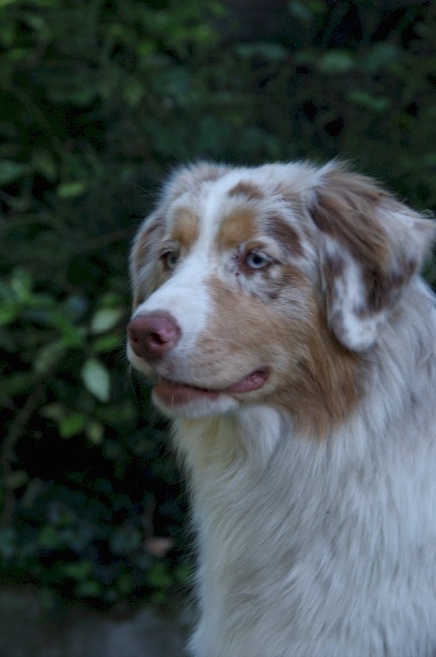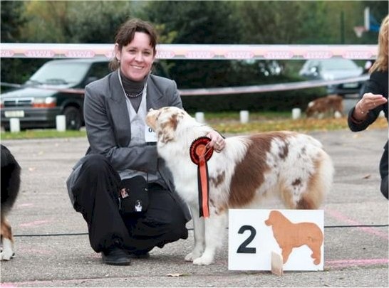 Chienne massive qui pourrait être plus féminine. Museau et crane larges. Dentition en ciseaux. Bon port d'oreilles qui malheureusement sont mal placées. Bonnes angulations. Bon poitrail. Très jolie couleur de robe. Se déplace de manière élégante avec un excellent mouvement.