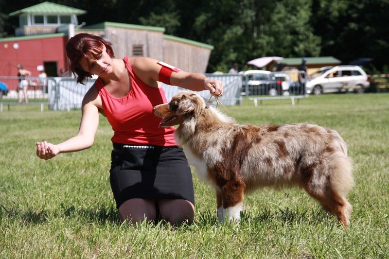 Joli sujet avec un excellent type encore un peu petite belle tete et expression oreilles correctes excellente encolure ligne de dessus excellentescuisses et jarrets excellente angulatrion avant poitrine très eclatée démarche correcte mais les antérieurs sont trop écartés le mouvement doit etre travaillé