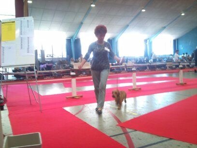 Femelle fauve avec excellent poil de couverture, j'aimerais plus dur sur les oreilles et la tête - Présentée un peu grasse - Exc poitrine - Très jolie tête féminine - Exc caractère - Chienne élégante avec belle sortie d'encolure - Serre un peu dans ses postérieurs - Antérieurs corrects - Exc présentation