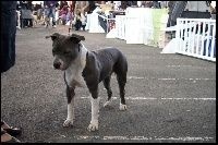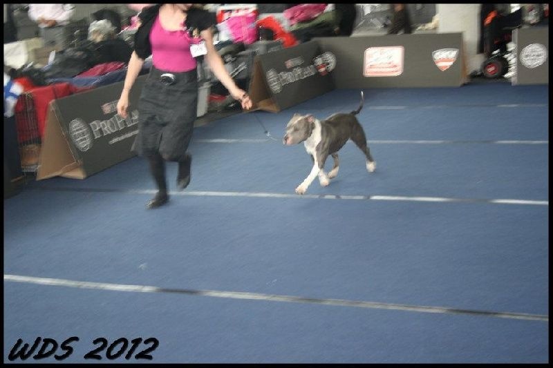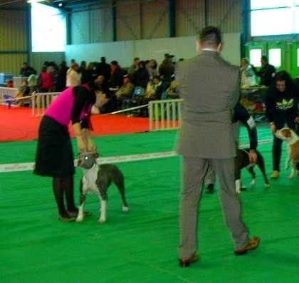 Dentition complète correct, Très bonne tête,Excellente angulation avant et arrière, Excellent dos. Serre légèrement à l'arrière en mouvement. Excellent mouvement de profil. Excellente présentation.