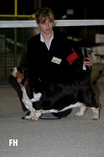 Blanche et noire à manteau. Bien établie. Bonnes tête et oreilles. Conjonctive trop apparente. Exc aplombs. Exc ossature. Le corps parait encore un peu long. Exc mouvement.