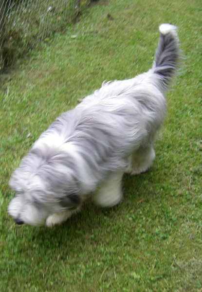Puppy Femelle : 7 mois. DCC. Jolie femelle dans son ensemble. B dans son type. Exc proportion, oreilles de bonne longueur. Exc ossature. Cuisses bien musclées. Exc poitrine pour son âge. Exc aplombs naturels Av/Ar. Fouet de bonne longueur, dos tendu.Mouvements un peu désordonnés en A/R. Il faut dompter son énergie.
