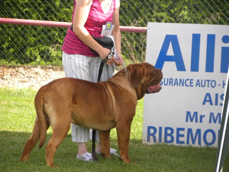 9 mois et 10 jours, classe jeune: encore très gamin, bonne tête, mâchoire infèrieure pourrait être plus large. oreilles placées un peu en arrière, bonnes épaules, bonne ossature, aplomb avant un peu ouvert, bonne poitrine pour son âge, bon fouet, manque de musculature a l'arrière.