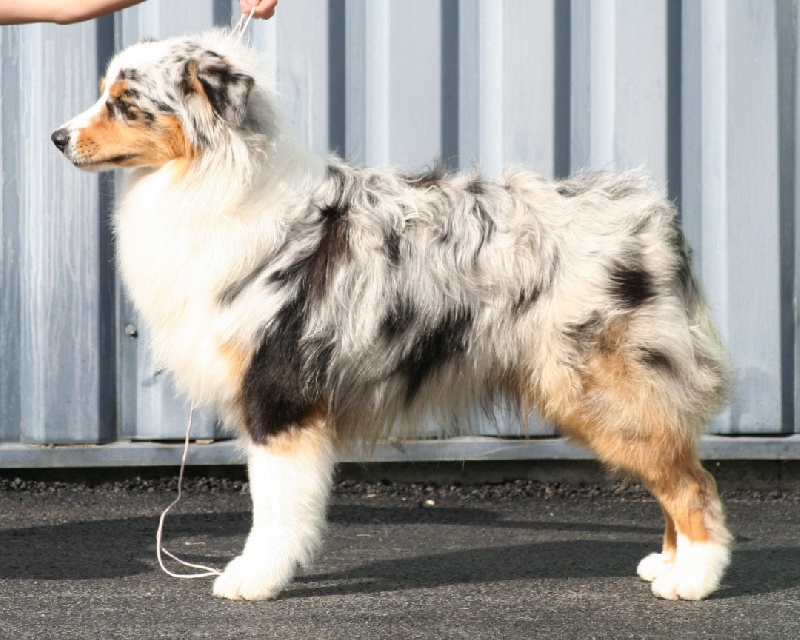 TRès joli chien puissant, yeux un peu rond, TB aplombs avants et arrières, Tb angulations avants et arrières, aux allures, légèrement panard.