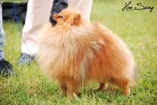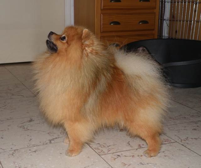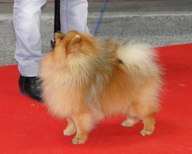D.C.Exc. proportions et construction. Excellente fourrure orange. Excellente tête masculine et expressive. Exc. ligne de dos et fouet. Exc. poitrine. exc. aplombs, angulations et pieds. Exc. démarche et allure.