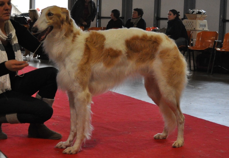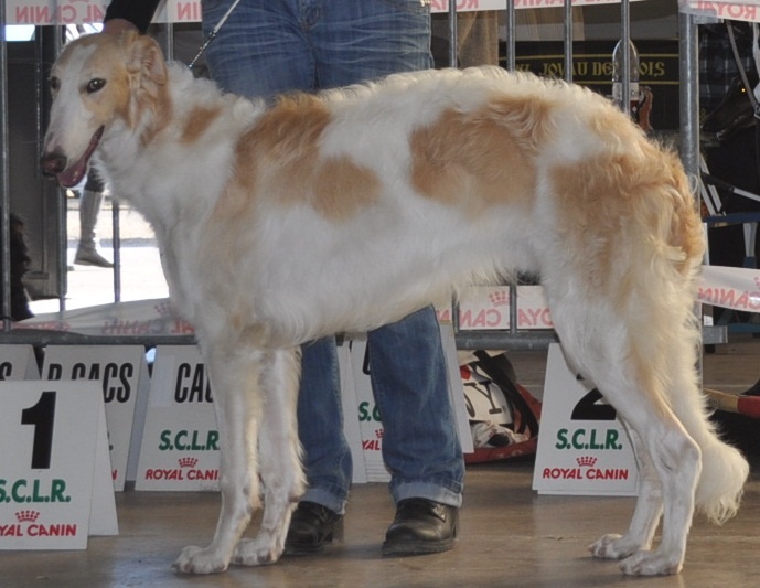 Jeune sujet( trop tôt pour la classe Inter), construction générale correcte avec une exc ligne de dos, rein, croupe, exc poitrine,exc arrière main, manque d'allonge( moi aussi) port d'oreille retombant (!)