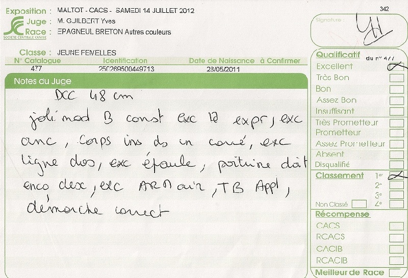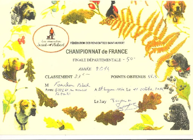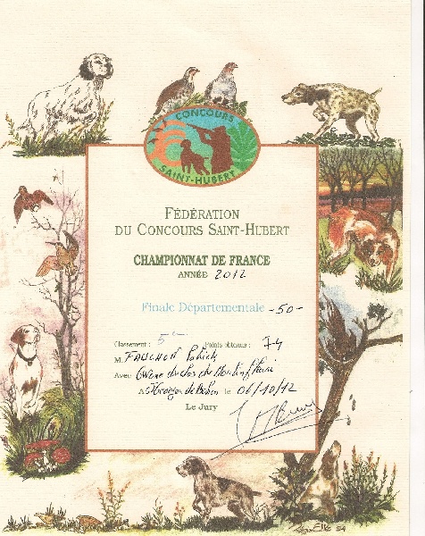 - 5e/30 dans sa catégorie chasseur avec chien d'arrêt au concours saint hubert de la manche en 2012 à seulement 15 mois.