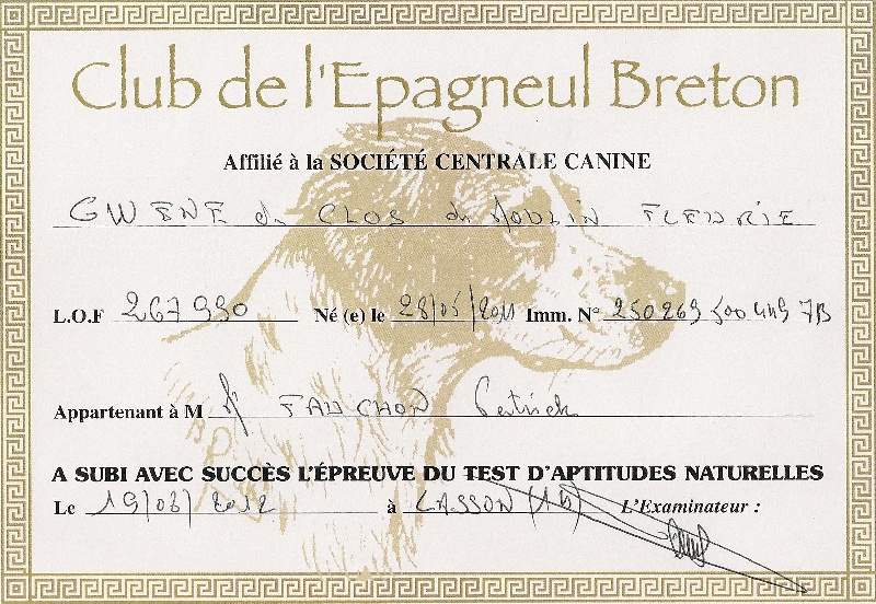 Chienne qui prend beaucoup de terrain, et qui montre une grande passion pour la chasse des oiseaux sauvages (bécassine, bécasse). Dès son plus jeune âge elle a montrée une forte passion et surtout une forte envie de chercher le gibier. Gwene est utilisée en chasse pratique (bécasse, bécassine, lièvres ...)