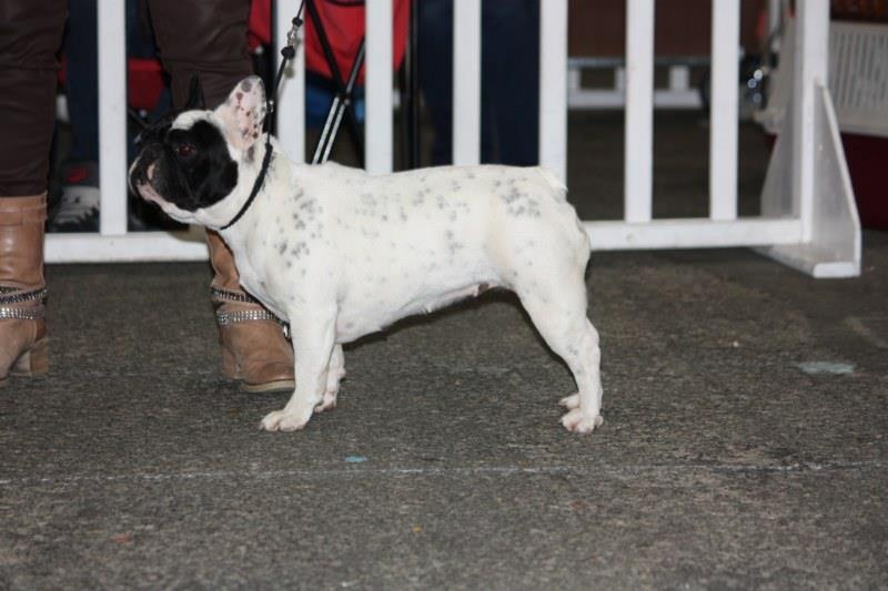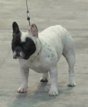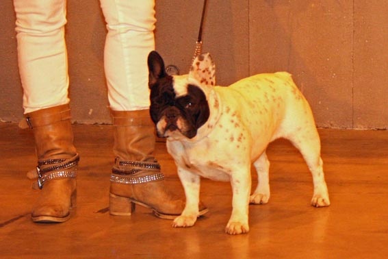 Bringé et blanc avec de la moucheture, prognathisme parfait, excellent dans son ensemble, petite queue courte, ouverture de poitrine et côtes correctes,excellente tête avec excellent profil, dents bien alignées, joli menton, démarche timide mais correcte.