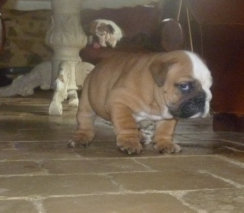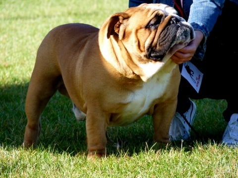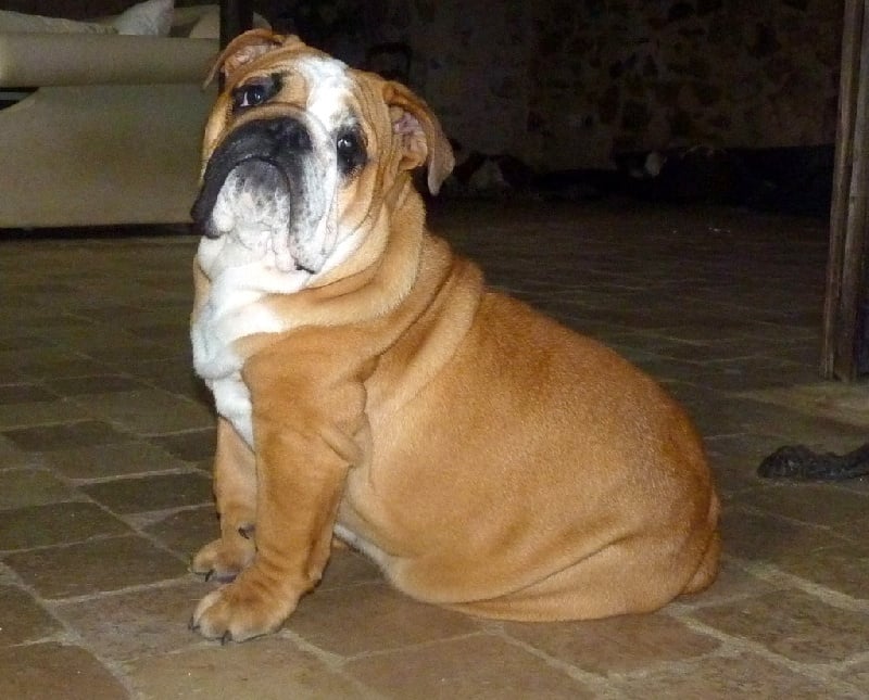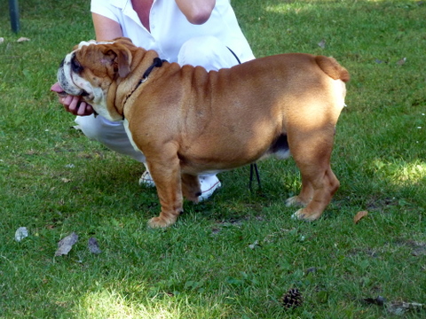 Fauve.en excelente condition.taille standard.tete avec une bonne expression typique.bon lay-back.ride sur le nez un peu trop lourde.yeux bien foncés.oreilles en rose.machoire large et bien recourbée.bonne ossature,bons aplombs avant.epaules bien rapportées au corps.poitrine profonde et bien descendue.cotes bien rondes.bon arriere main.bonnes angulations arrieres.bons pieds,queue bien placée.demarche lourde et contrainte typique.excellente presentation.chien calme et agreable.