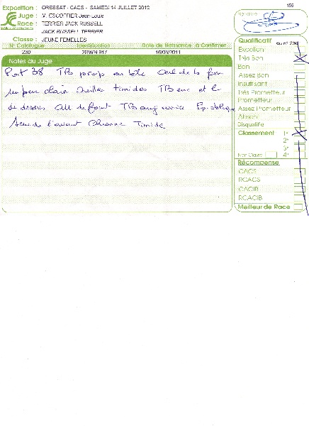 Poitrine 38.Très bonne proportion en tête.Œil de bon format, un peu clair.Oreilles timides.Très bonne encolure, ligne de dessus et attache de fouet.Très bonnes angulations arrière.Epaule oblique.Serre de l'avant.Chienne timide.