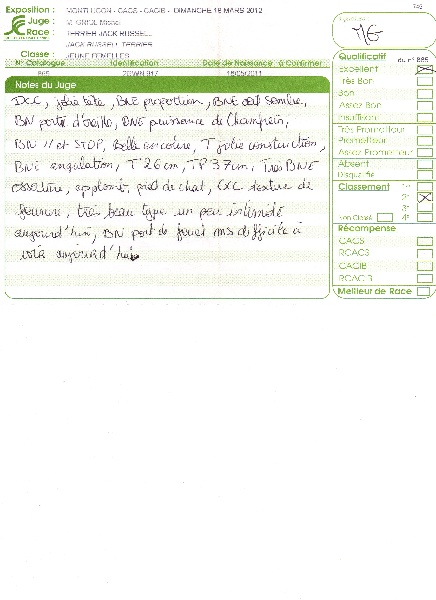 Dentition complète, jolie tête, bonne proportion, bon ?il sombre, bon port d'oreille, bonne puissance de chanfrein, bon parallèle et stop, belle encolure, très jolie construction, bonne angulation, T26cm, TP37cm, très bonne ossature, aplomb, pied de chat, excellente texture de fourrure, très beau type, un peu intimidée aujourd'hui, bon port de fouet mais difficile à voir aujourd'hui.
