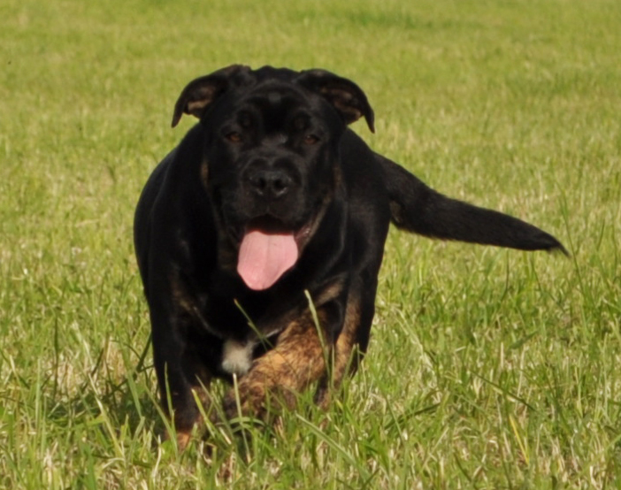 Chien encore très juvénil - Tête pas éclatée - Très fort prognathisme - Ligne de dos correcte - Excellente croupe - Bonnes angulations - Sort un peu les antérieurs - Allures faciles - Excellent Caractère