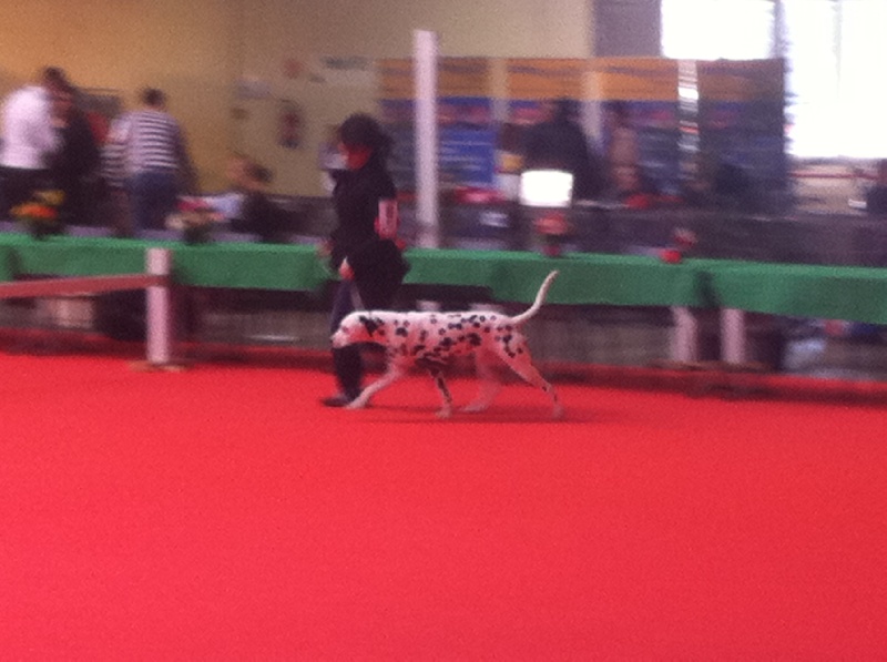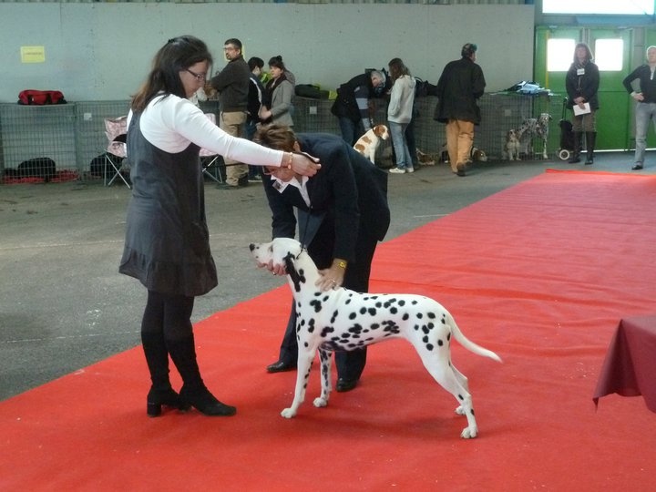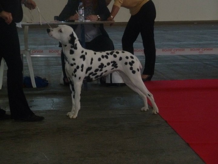 TB type et expression, bonne tête, DCC,oreilles très bien placées, Bonne construction d ensemble,Bonne ossature, Exc aplomb et angulations, taches un peu envahissantes (ndr !!!!!!) exc allure et port de fouet