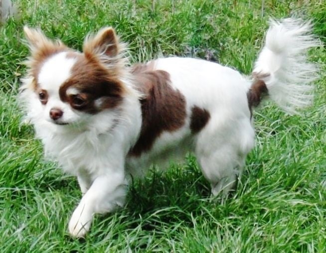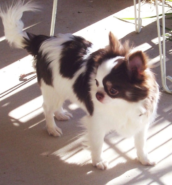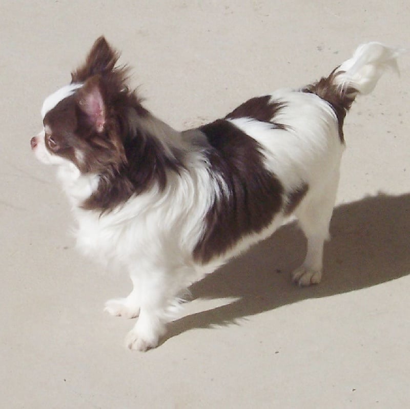 JIA superbe chihuahua, superbement typée, très bien construite de couleur chocolat et blanche, bouche parfaite en ciseaux et fontanelle fermée comme sa fille Ice Vanilla.