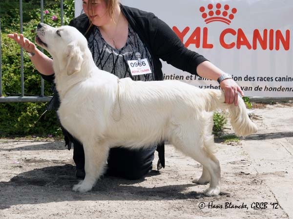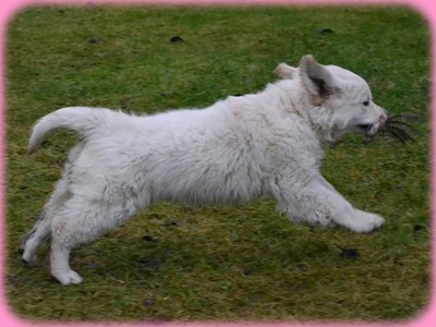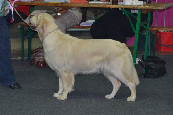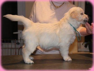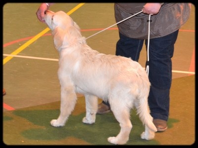 Presque 5 mois Très bon Type, Tête et expression correcte, un peu de Fanon,Dos encore faible, angulation avant et arriere correctes, Bonne ossature,poitrine déja bien formée, jarrets trop rond et se trouve sous le corps, pattes arriere trop longue