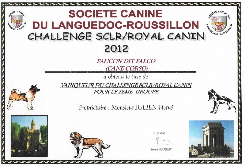 Vainqueur du Challenge 2012 Sté Canine Languedoc-Roussillon/Royal Canin : Champion du Languedoc-Roussillon pour le 2ème Groupe