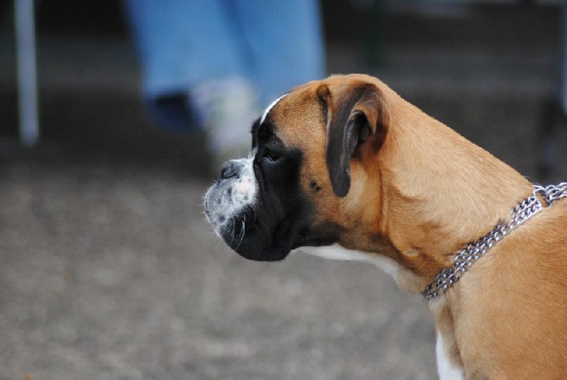 Taille moyenne fauve, marqué en blanc, tête typée avec trés bon rapport crane museau, bonne hauteur de front, oreilles bien portés, yeux marron, museau en rapport avec le crane, menton marqué bonne sortie d'encolure, construction carrée avec forte ossature, angulation avant et arriere exactes, le dos manque de fermeté, fouet bien porté,