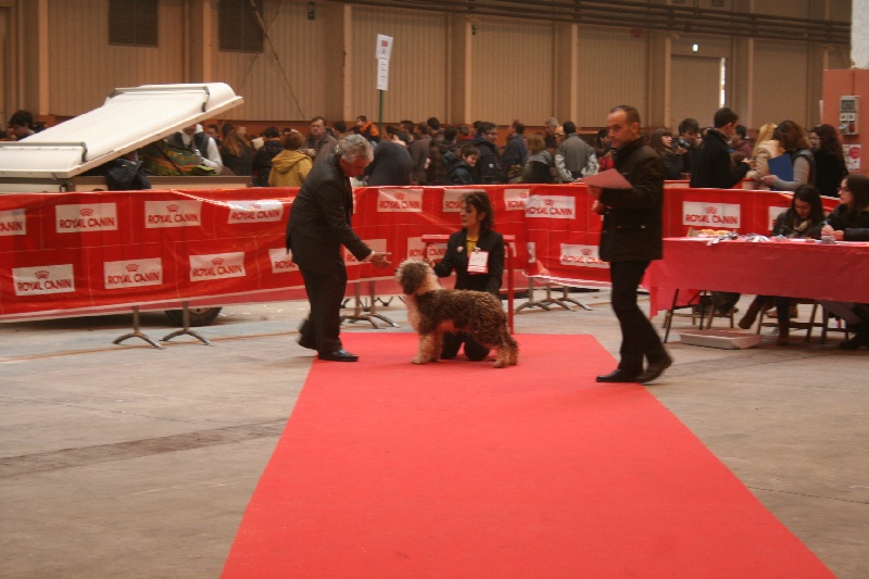 Excll sujet bien dans type et taille, excll tete teux, belle expression typique, exccl encolure et ligne de dessus, poitrine et cottes, pieds et pattes. Excll texture et couleur. Se présente remarquable, et excll mouvement