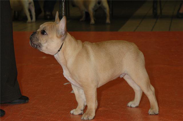 Exc sujet complet fauve sans charbonnure. Exc ligne dessus dessous, bonnes côtes, bon pieds de chat AV AR, queue présente très courte, exc prognatisme, exc crane, oeil un peu clair, oreilles bien placées, exc encolure, démarche correct.