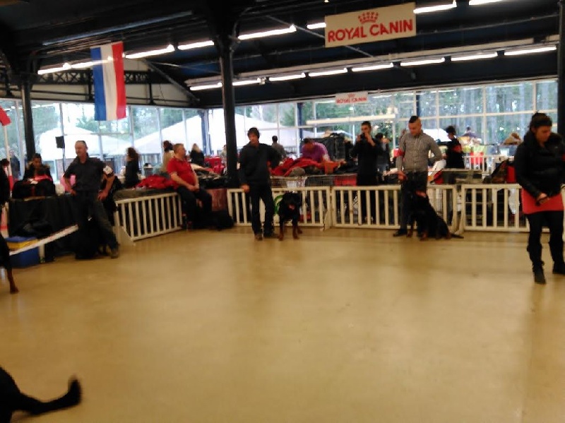 DCC. Bonne taille un peu long bonne ossature, très bonne tête bonne expression, œil un peu clair bonne pigmentation. excès de babines bon avant dos correct très bon dessous Excel arrière bien angulé. bonne présentation bon feux bon caractère. queue bien portée aux allures mouvement correct.