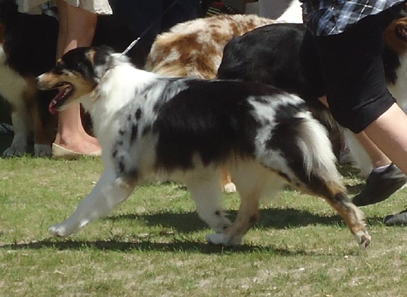 Sujet bien féminin, tête correcte dans son ensemble avec de très belles oreilles. Excellente proportion de la tête. Stop correct pour un bleu merle. DCC. La ligne de dos est droite et solide. La cote est un peu ronde. Epaule correcte. Excellentes allures avec un dos qui roule un peu. Texture de poils un peu douce.