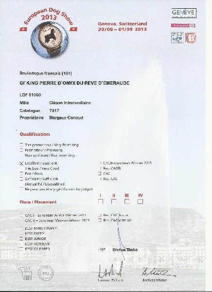 Le standard n'a pas été appliqué en ce qui concerne le jugement de cette classe jeune où se trouvait mon Gi'King. Le noir n'est pas une robe bringé et le syndrome brachycéphale ne doit pas permettre à des chiens de remporter un CAC Jeune.