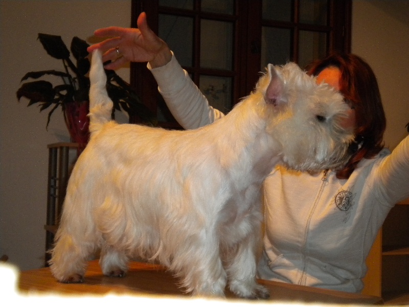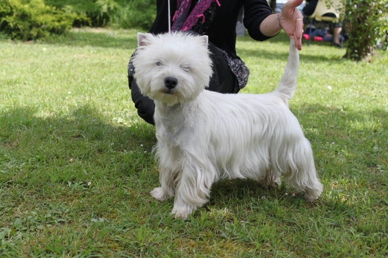 Parfaitement dans la taille. Exc mouvement. Partie arrière typique du westie. TB tête et crane. TB oreilles, petites et bien placées. Exc expression. Exc dos. Exc côtes. Exc poil et texture. Exc caractère.