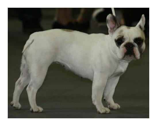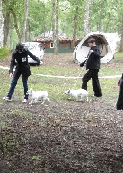 Chienne un peu légére presque toute blanche avec pigmentation bien foncé , téte correcte bien carré , cou long , bonne angulation, rein un peu long , mouvement correct .