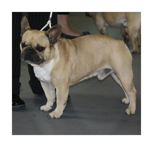 Tb sujet se présentant au max du poids .Complet fauve clair ,queue croqué bien placé ,ongle noir ,pied av ar correct , tb angulation ,tb crane,oreille bien placé,tb avant main,prognatisme présent complet ,démarche correcte .