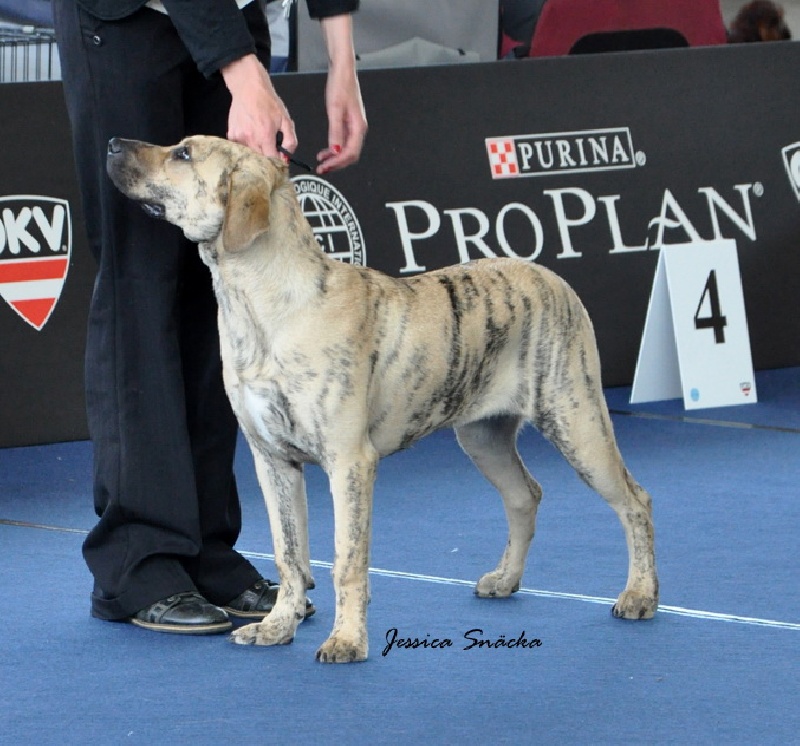 EXC ensemble robuste et viril- DCC- Tête type et expression correcte- B rapport crâne/chanfrein- Ossature correcte- EX applombs et angulation- Jolie fourrure bringée- Fouet de B longueur- Allure et port de fouet corrects