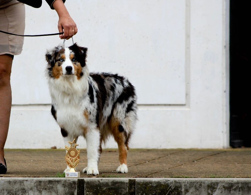 bleue merle , 1an , bien dans le type , jolie tête très expréssive , jolie proportion d'ensemble , exc ossature , aplombs réguliers, exc angulations , encolure bien sortit , exc ligne de dos , exc A/R exc mouvement de profil .Meilleure jeune