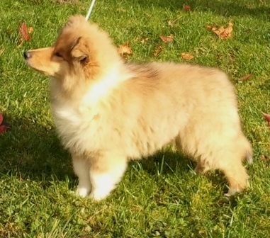 9 months, sable, not a big dog, enough bone, nice body shape, beautiful head, well set and placed eyes, ears a little heavy, beautiful expression, lovely well presented coat, moved well.