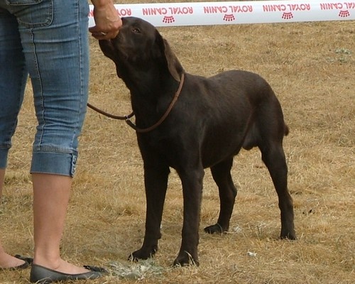 H.57 cm,bonnes proportions de tête avec une oreille bien implantée, léger fanon, encolure un peu courte, Exc lign de dessus, fouet et attache, poitrine, angulations arrières, TB à l'avant.Exc pieds, exc allures.