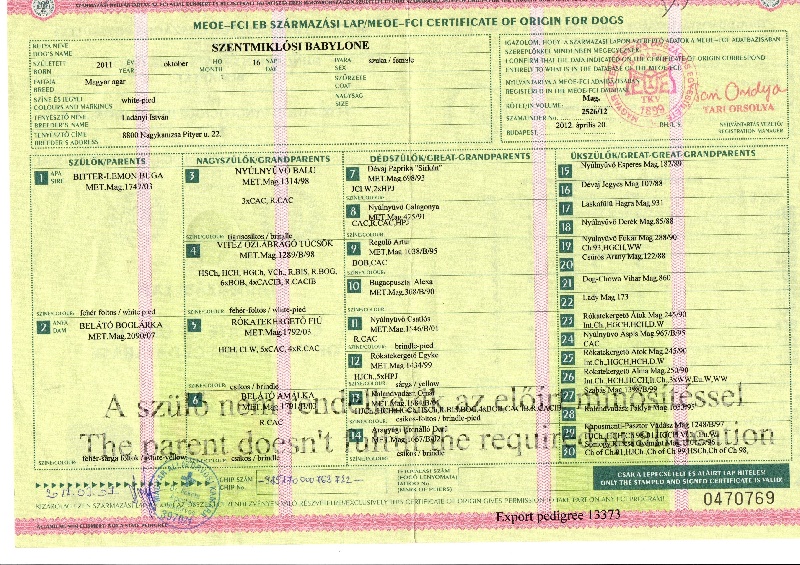 Pédigree de Szentmiklosi babylone dite baby one (Sans Affixe)