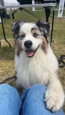 19 mois - femelle bleue merle - attractive, feminine bitch - nicely balanced head - ears well placed - good bones - good feets - little bit crooked in front whe she's stand - good topline and croup - moves freely but elbows out in front