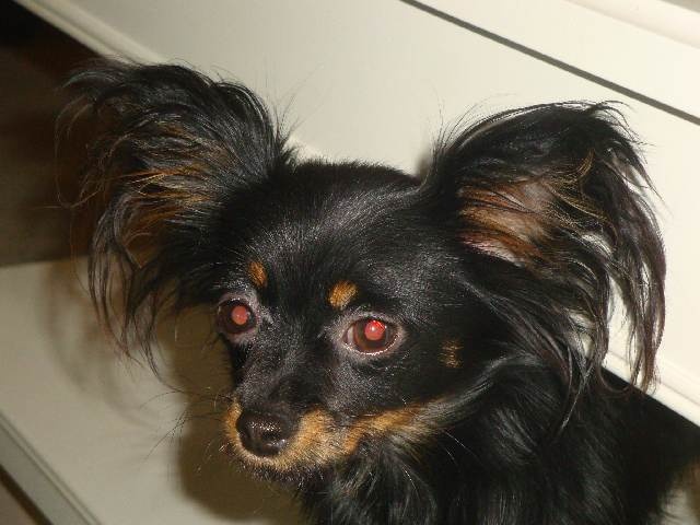 Noir et feu avec feux bien colorés. Très bonnes proportions en tête, oeil bien foncé, oreilles grandes frangées et bien portées. Excellente construction. Antérieurs bien parallèles, dos bien droit, fouet bien inséré. Beaucoup de caractère. Jolie expression. Excellents mouvements.