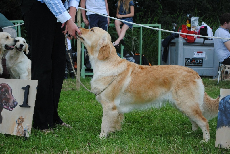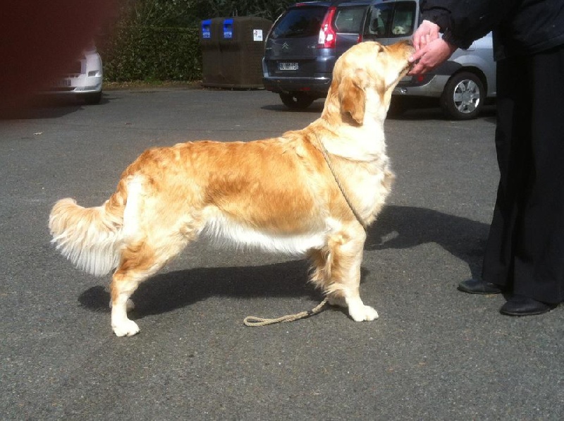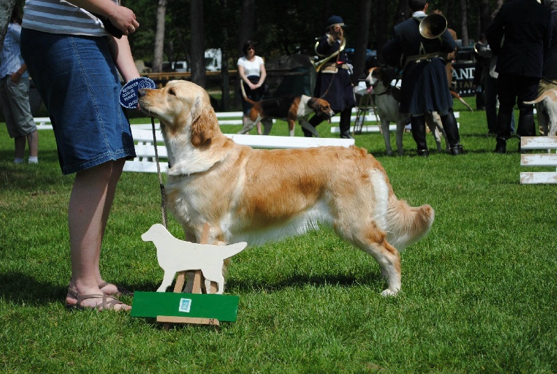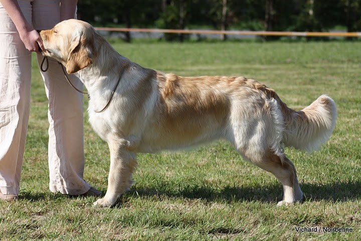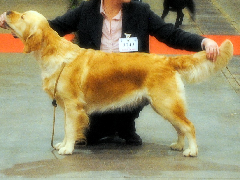 powerful bitch, well within the type, well-proportioned. lovely golden color. head properly conformed. correct neck, shoulders, top-line, chest, hin quarters. excellent coat, feet. moves with ease