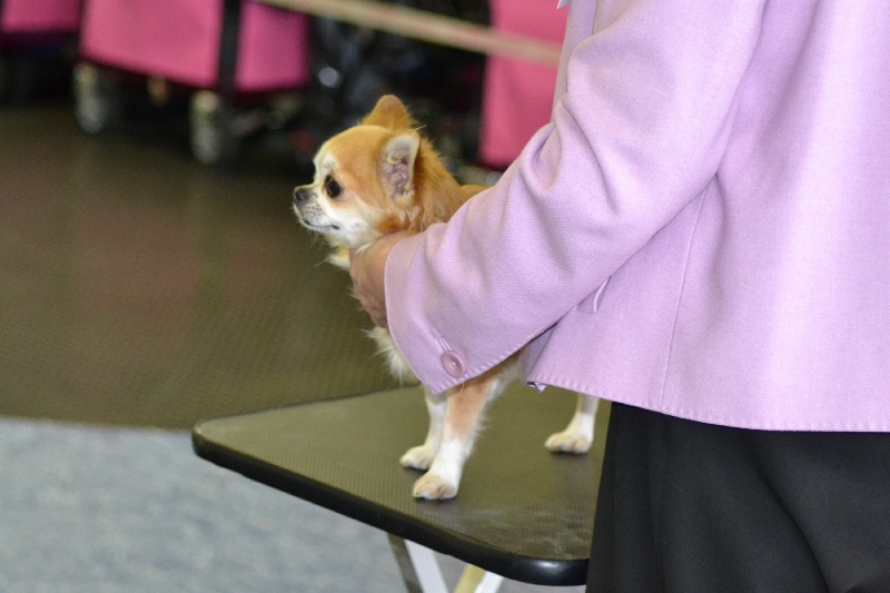 Très bon format et silhouette, tête très bien construite avec crâne assez en pomme, articulé correct, corps bien proportionné, très bonne ossature, très bons aplombs et pieds, se déplace correctement mais très dissipé dans le ring et réservé sur la table