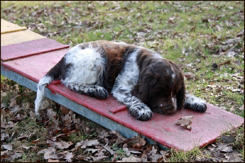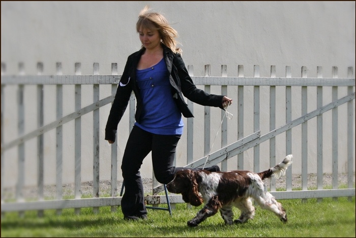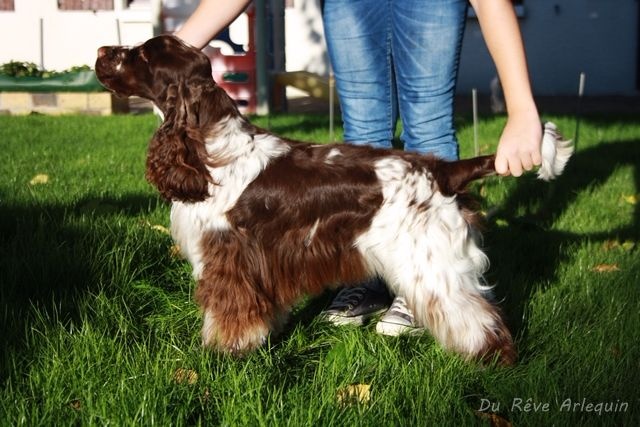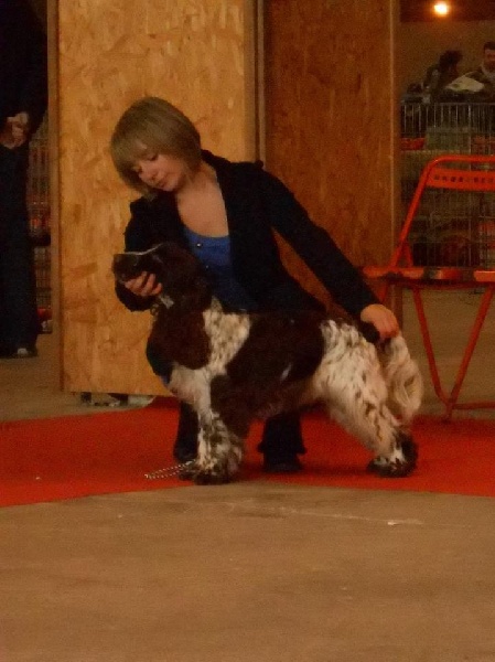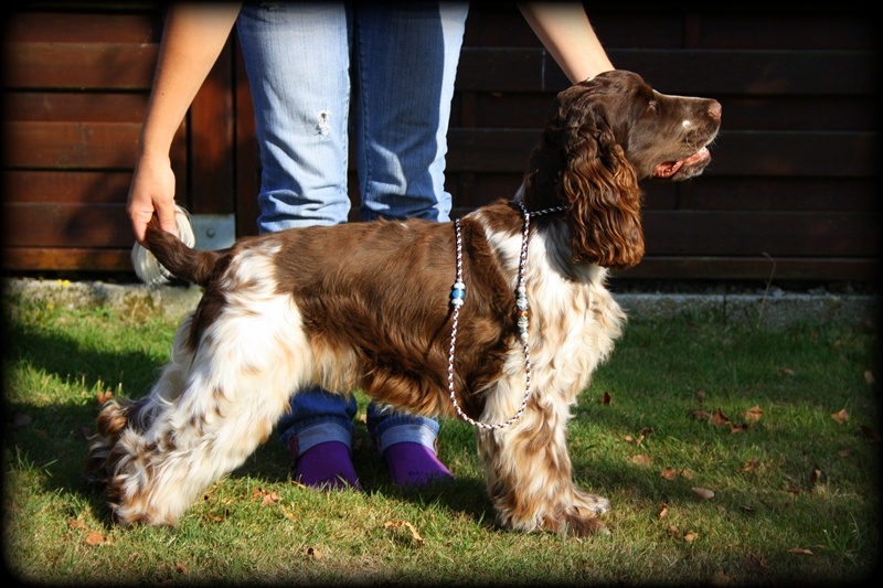 Chocolat et blanc, à la limitte sup. de la taille, jolie tête mais lignes pas trop parallèles, les yeux doivent foncer, bonne ossature et bons pieds, l'épaule est encore un peu droite, bonne arr. main bien musclée, bonne attache de fouet, belle qualité de fourrure, marche correct.
