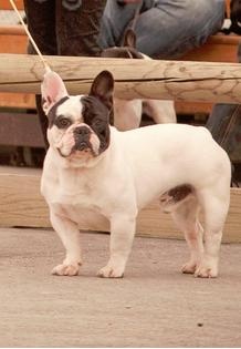 jolie tête bien ridée, exc crâne, exc yeux, mâchoire correcte, exc sortie d?encolure, exc ossature et forme des côtes, queue bien inérée, le blanc n'est pas taché, bonne démarche, sujet un petit peu long