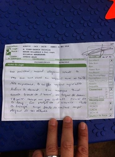 Un peu surpris par ce très bon. Il est dommage que la juge n'ait pas tenu compte de l'énorme stress des chiens après deux jours de voyage. Il est vrai que "Fashion" était intenable sur le ring. Ce résultat en demi teinte est malgré tout contrebalancé par un slip reconnaissant ses qualités. Voici une retranscription du slip : "" DCP. Bon rapport crâne chanfrein. Yeux de bonnes formes et couleur. Bon port d'oreille. Excellente encolure. Poitrine suffisamment profonde. Dos tendu. Excellente croupe. Excellent fouet de bonne longueur. Excellente ossature. Bon mouvement de profil un peu retenu. Apl. au regal. Le fouet se porte haut en action. Tendance à serrer légèrement les postérieurs en action. """