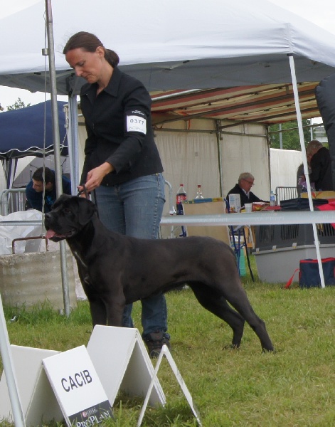 Noir, DC, Exc tête, crâne et chanfrein, encolure, garrot bien marqué, ligne de dos soutenue, Exc ossature et Exc aplombs, à la démarche a tendance à sauter