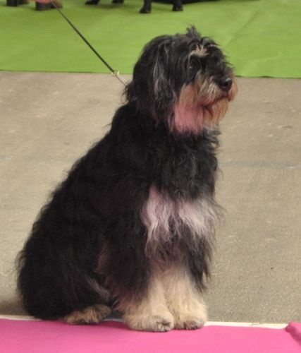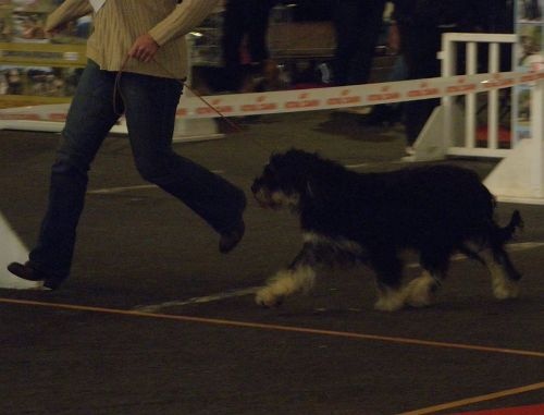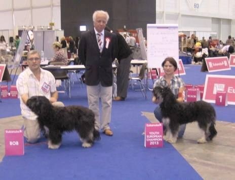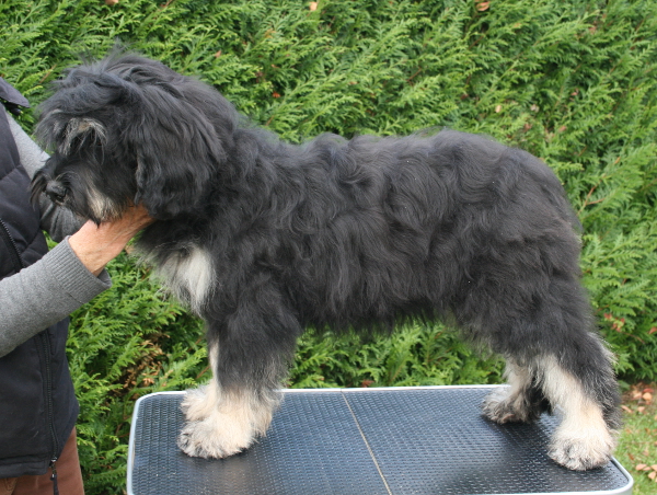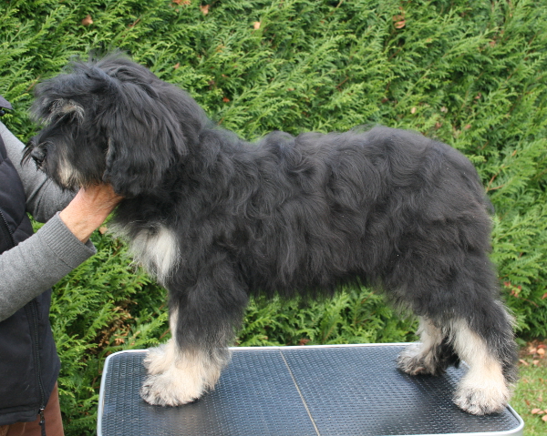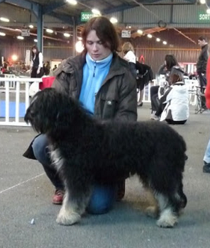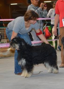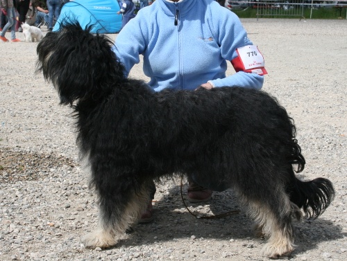 sujet bien construit, tête bien proportionnée, TB oeil forme couleur, TB articulé, TB rapport L/H, exc.ossature, antérieurs un peu ouverts en statique, exc.qualité de poil, exc.caractère et présentation, se déplace TB, devra prendre un peu de substance