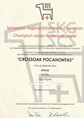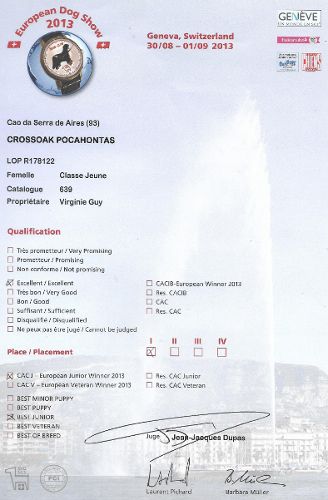 Le mot du juge dans la revue du club : "... quel sujet ! excellent format bien dans le standard; très belle expression, se déplace très bien; très bon poil et fourrure avec juste ce qu'il faut de rusticité ... Au moment de désigner le Meilleur sujet de la RE, mon choix s'est porté sans hésitation sur la très représentative Serra de Aires."