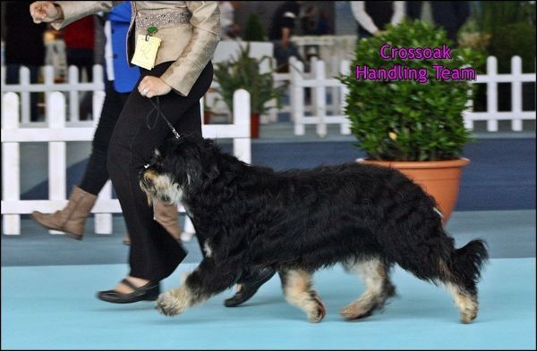Sujet dans le type, tête bien proportionnée, exc.oreilles, belle présentation, exc.caractère, exc.poitrine pour l'âge, TB angulations, exc.texture, marche déjà bien