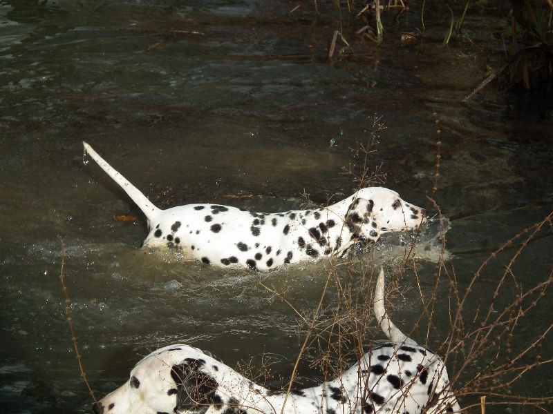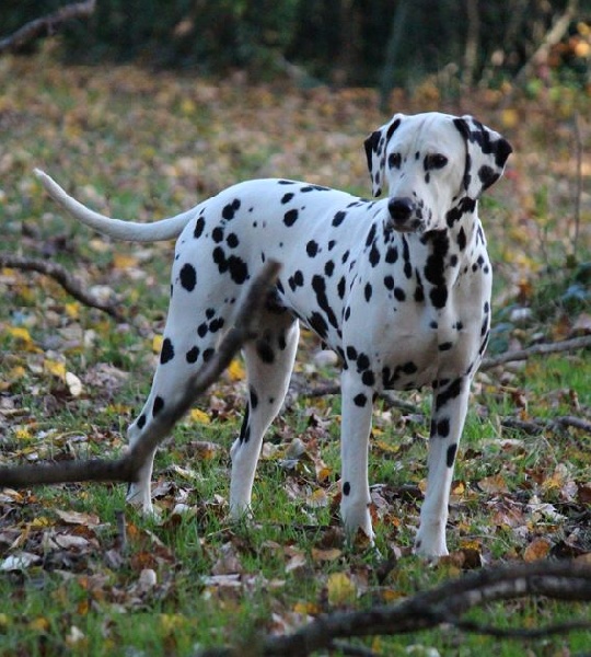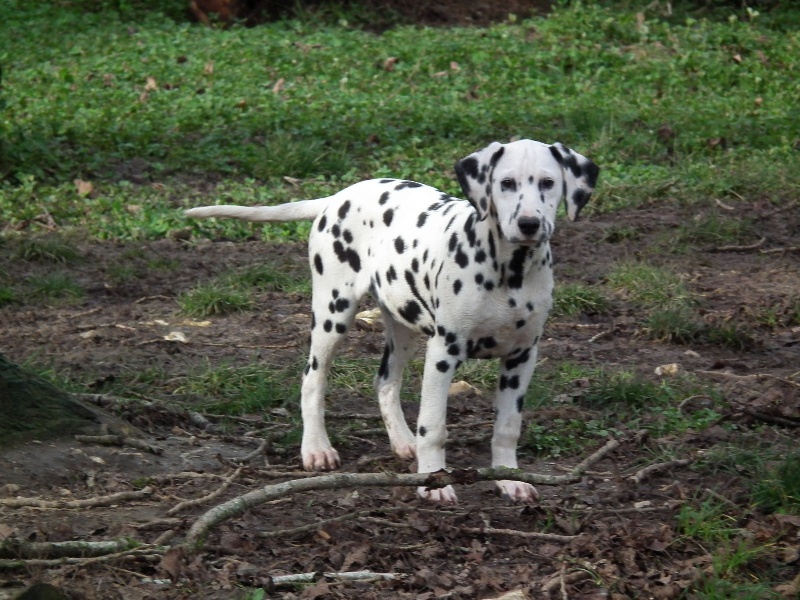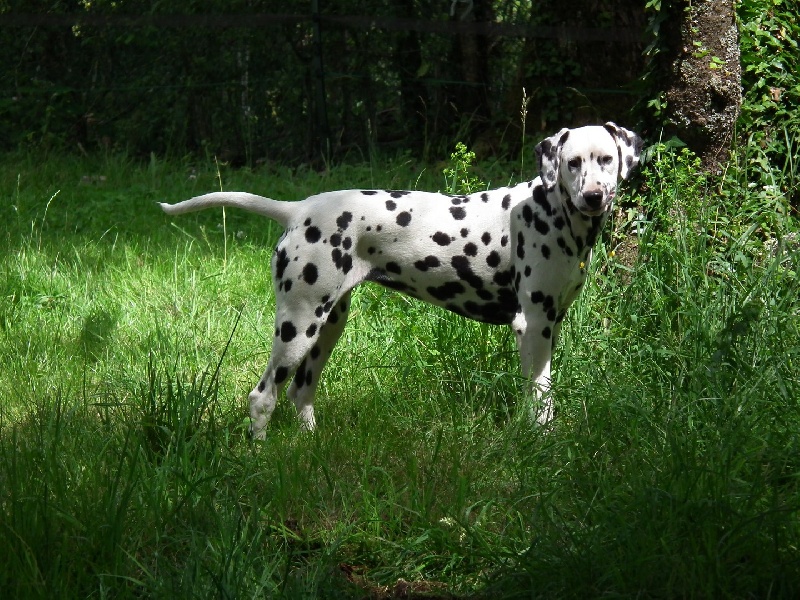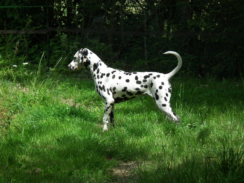 DCC. Tête féminine. Exc oeil bien foncé. Exc rapport crâne/chanfrein. Oreilles bien placées et tachées. Ant bien parallèles, garrot bien dessiné. Pied manque un peu de fermeté. Exc répartition des taches. Le dos est un peu instable en mouvement. Fouet bien inséré, exc. musculature. Exc ang. AR