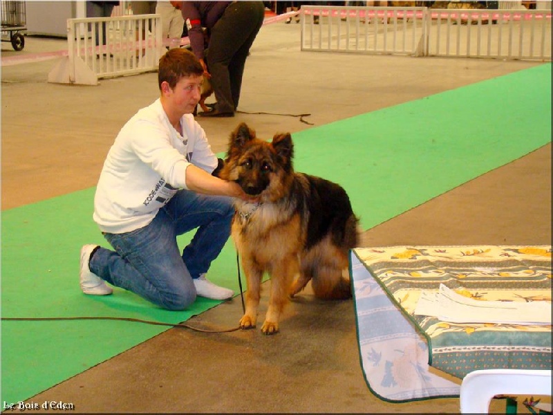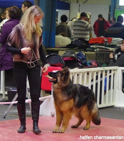 Classe Jeune (9 mois 1/2) : "DCC, bon type, plutôt petit modèle, bonnes proportions, angulations arrières prononcées, bonnes angulations avant. Bonne ligne de dessus, croupe un peu moins inclinée. Front correct, bonne tête, masque prononcé. Aplombs arrière et avant corrects. Très bonne mécanique de marche."