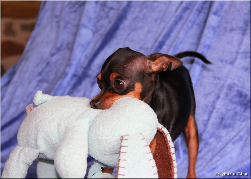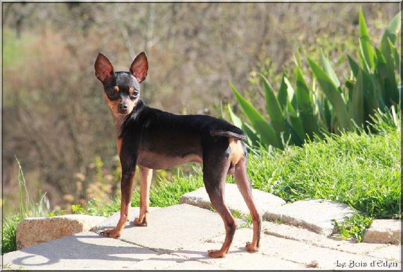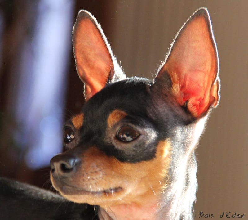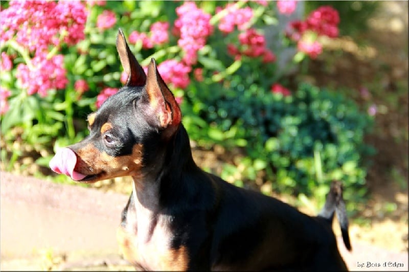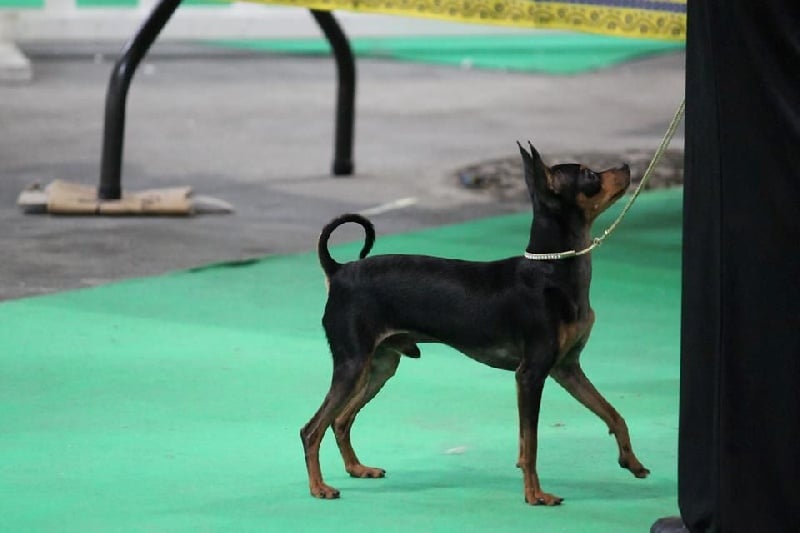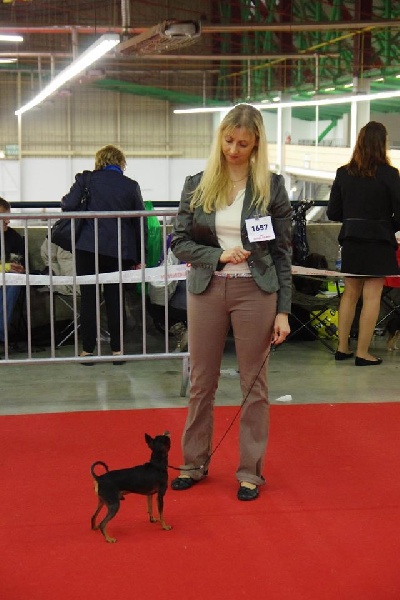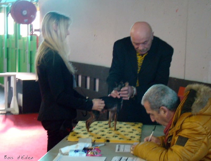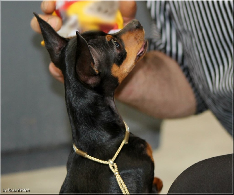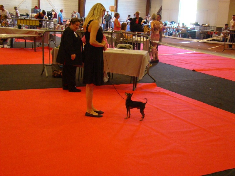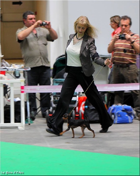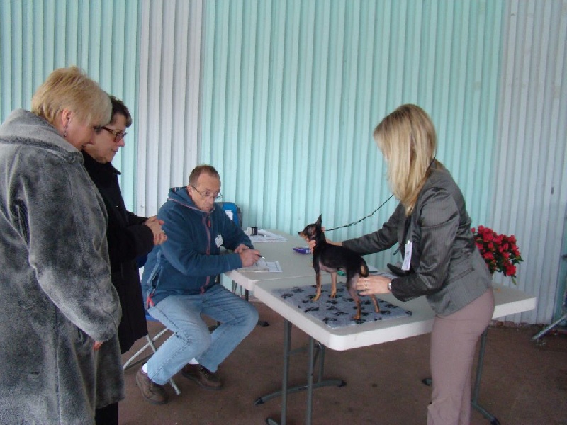 Classe Champion : "Bicolore noir et feu. Excellentes oreilles bien placées et de bonne longueur. Excellent rapport crâne/chanfrein, oeil bien foncé. Lèvre bien ajustée. Excellente denture. Bonne sortie d'encolure. Excellent format, excellente proportion hauteur au garot et longueur. Avant bien parallèle. Excellente qualité de poil, jolie poitrine, dos bien soutenu. Bonne insertion du fouet. Excellente musculature. Excellentes angulations arrières. Mouvement tonique. Joli sujet avec une très bonne construction. Tête très typique."